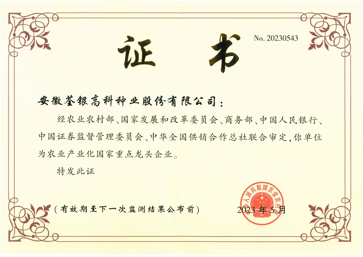 安徽荃銀高科種業(yè)股份有限公司是一家“以種業(yè)為核心、農(nóng)業(yè)服務(wù)為延伸、探索和創(chuàng)新農(nóng)業(yè)多元化發(fā)展”的現(xiàn)代高科技種業(yè)上市公司,證券代碼:300087。公司注冊資金9.47億元,系“中國種業(yè)領(lǐng)軍企業(yè)、農(nóng)業(yè)產(chǎn)業(yè)化國家重點(diǎn)龍頭企業(yè)、國家高新技術(shù)企業(yè)、農(nóng)業(yè)部首批農(nóng)作物種子育繁推一體化企業(yè)、中國種業(yè)信用明星企業(yè)"。在國內(nèi)控股子公司20多家,在國外設(shè)立分支機(jī)構(gòu)4家,良種銷售至全國20多個省(市、區(qū)),出口覆蓋20多個國家與地區(qū),種業(yè)綜合實(shí)力、雜交水稻研發(fā)、推廣及海外業(yè)務(wù)規(guī)模均居全國種子企業(yè)前2位。